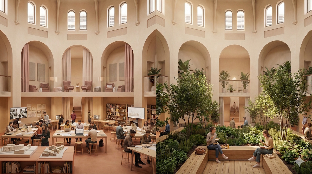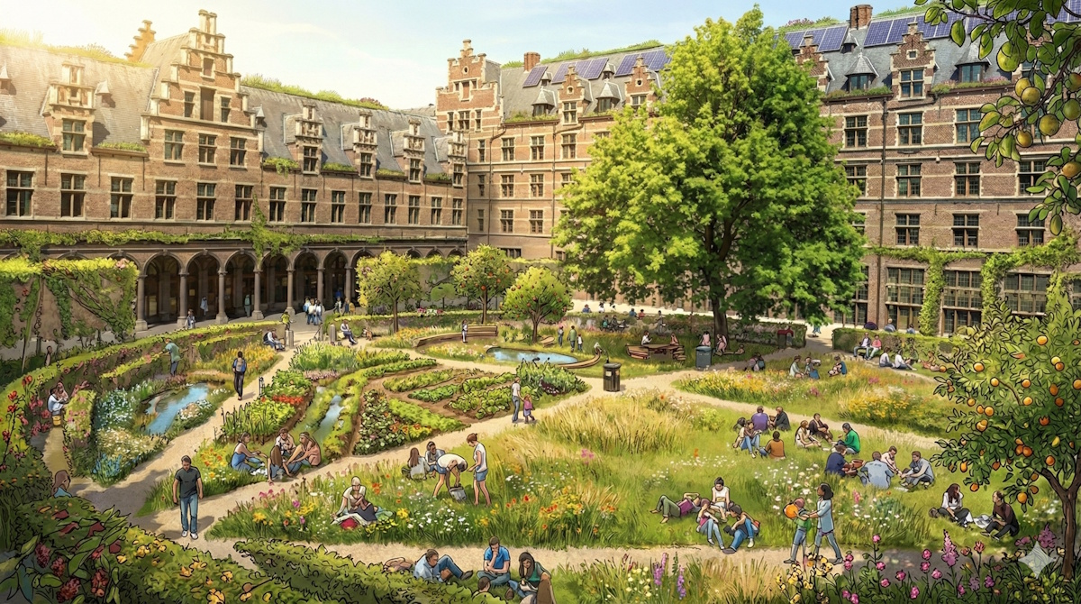 Er zijn zones voor denken en voor zijn. We zien leerateliers waar kennis stroomt en rustige kamers voor reflectie. We zien studenten en onderzoekers samen lunchen in de pluktuin, vergaderingen in een ruimte met zachte akoestiek. Wie hier 's avonds vertrekt, vertrekt opgeladen.