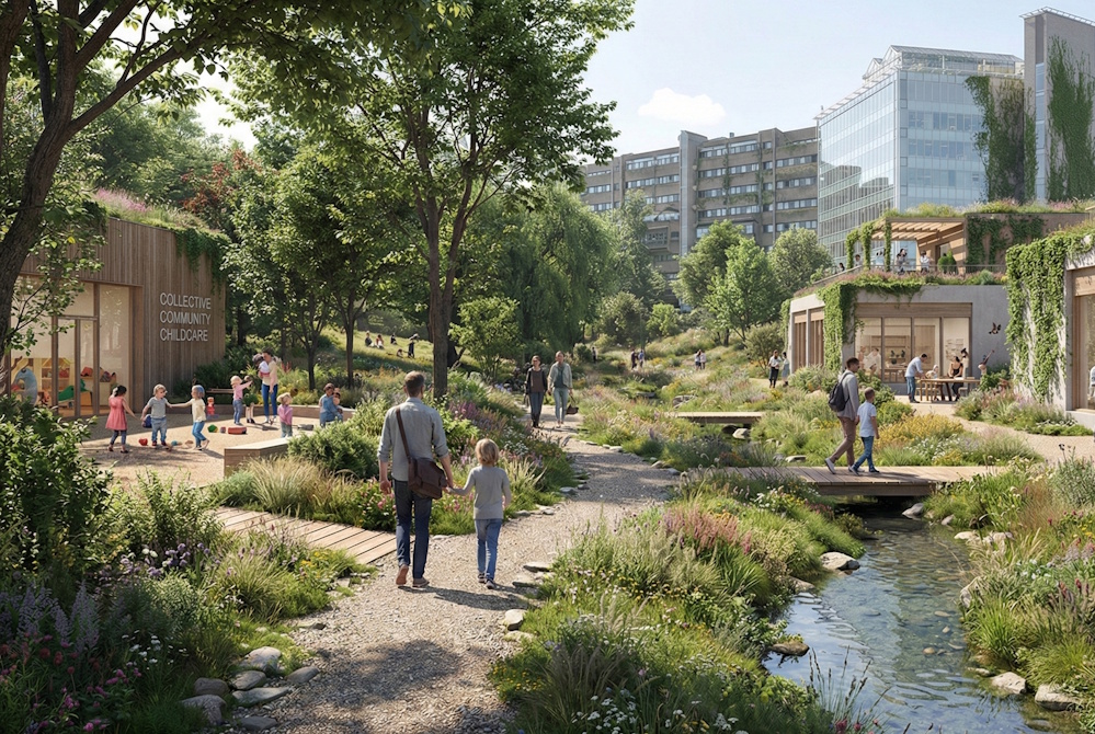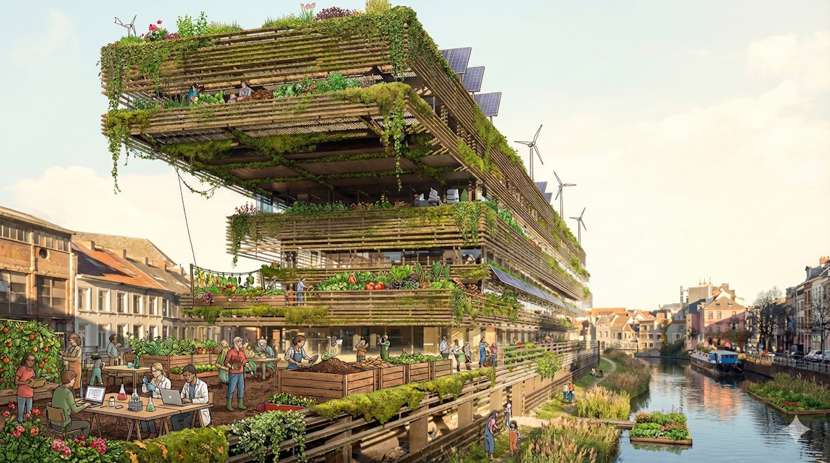 We zien een campus die aanvoelt als een lange wandeling, een landschap. Deze campus is gegroeid, in plaats van gebouwd. Geen façade met aangelegd groen, maar een ecosysteem vol bodemleven, wilde vogels, schaduw en licht. Tussen de gebouwen kronkelen paden, groeien kruiden en stroomt water. Je hoort stemmen uit open werkplekken, ziet kinderen spelen in een collectieve opvangplek, loopt voorbij een bibliotheek waar iedereen welkom is.